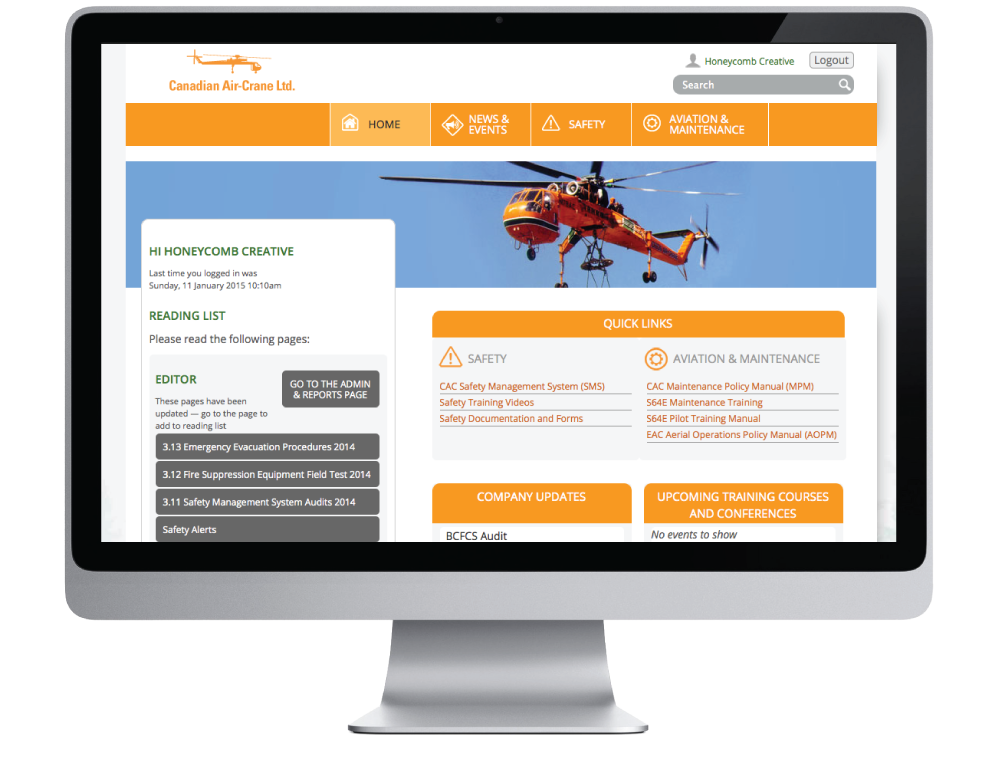 This intranet handles all of Air-Crane’s safety documentation and auditing of updates and tracking of required staff reading. When any staff member logs-in, they are alerted of any changes in the safety documentation they are required to read. Once they verify they have read a document, it is recorded in the audit file. The scrolling sidebar helps user track where they are in this large site. Retention and sorting of required documents is easily handled just by uploading the files and checking a category. Printer-friendly pages allow the changes to be easily added to hard-copy safety binders. A a collapsing side navigation and relevant site search helps users find what they want in this very large site.